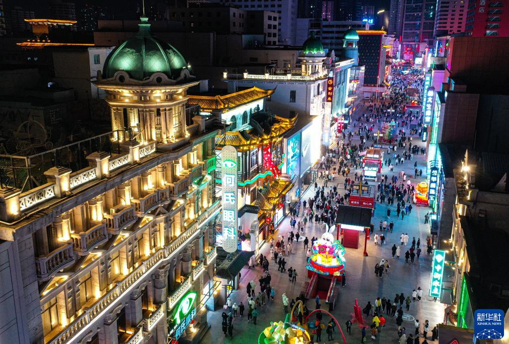 1月25日,市民在沈阳中街商业街上休闲购物(无人机照片)。