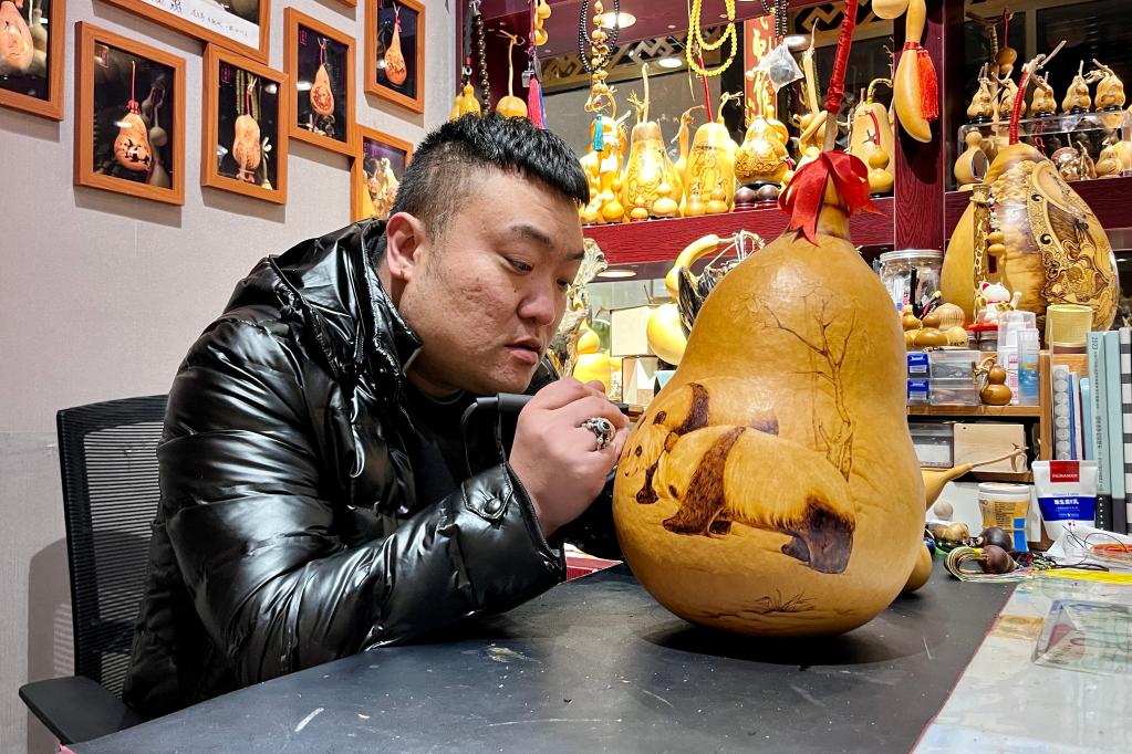 “葫芦就是‘福禄’,买回家添喜气。这些天,我们店里一天收益过千元。”在哈尔滨市福禄聚工艺品店,“80后”店主王帅通过烙画、墨刻、针刺等多种方式,将大大小小的葫芦制作成精美的手工品,包括摆件、挂件、把玩件等,受到欢迎。顾客还可以订制各种图案,如熊猫、仙鹤、祝福语等。