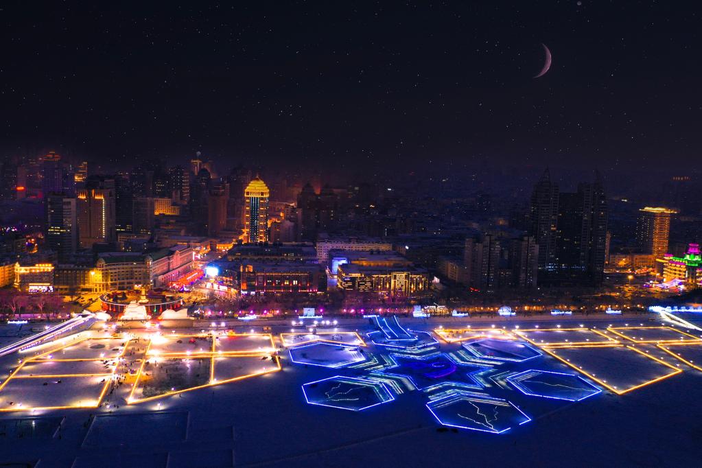 春节期间,哈尔滨松花江冰雪嘉年华夜景航拍。(受访者供图)