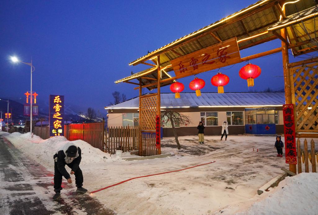 1月21日,南沟村村民邵锋在自家经营的乐雪之家民宿门口与雪友一起放鞭炮。 新华社记者颜麟蕴 摄