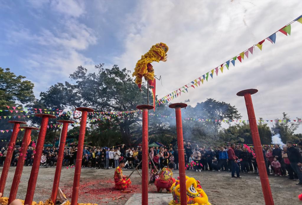 在广西藤县和平镇白沙村400多年的古树下,村里的老老小小聚在一起祈福迎春。舞狮人早早来到这里,威严的狮桩阵一字摆开,好奇的村民昂头望向桩顶,想象着这将会是一场多么精彩的舞狮表演。