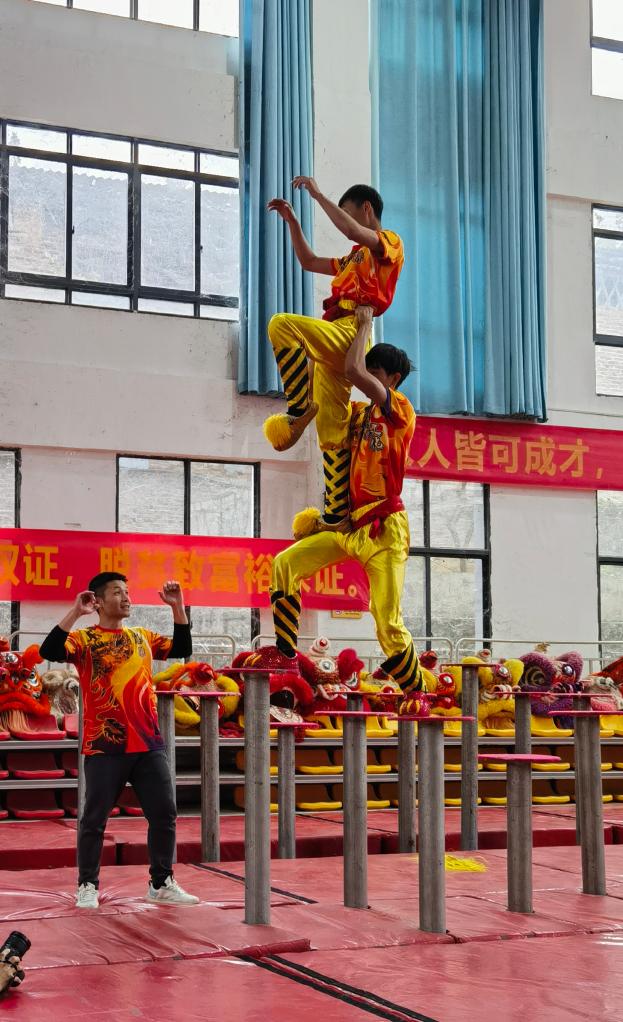 狮头狮尾两人默契配合、行云流水,在高桩上表演着一系列高难度动作:“金狮倒挂”“绝壁采灵芝”“探峰攀崖”“独桩挟腰转体450°绝技”……惊险刺激而又出神入化的表演,引得观众连连拍手叫绝:“原来高桩上还可以这样舞狮!”