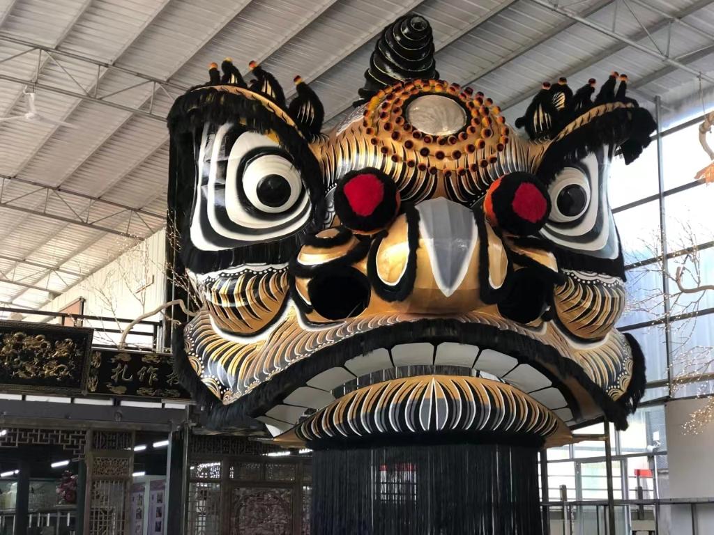 走进占地1000多平方米的扎作艺术馆,首先映入眼帘的是一个巨型的狮头扎作品,雄狮惟妙惟肖,神气十足。平日里,学生们就是在这里制作出一套套精美的狮头狮袍和文创产品。