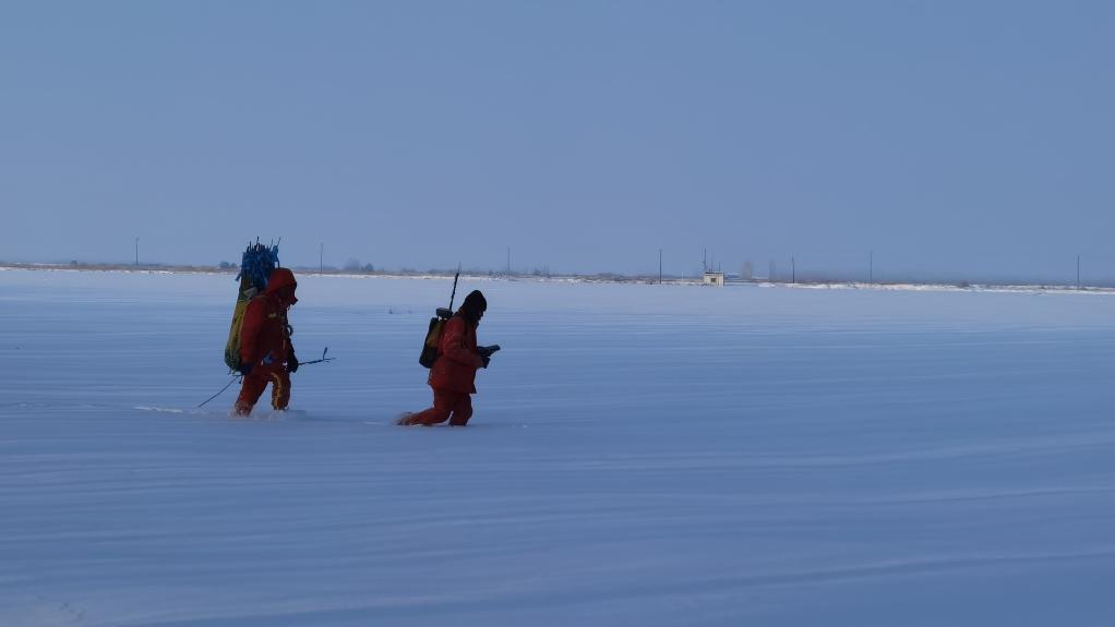 茫茫雪原中,物探工人正在工作。新华社记者顾煜 摄