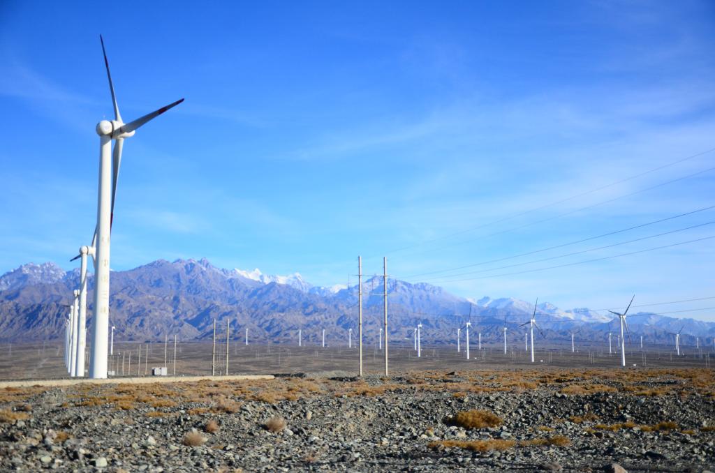 连日来,在“中国风谷”达坂城风电场,辽阔的戈壁滩上分布着一排排风电机组,片片风机叶片随风转动。巡检工人顶风而行,保障一台台风机源源不断送出清洁电力。