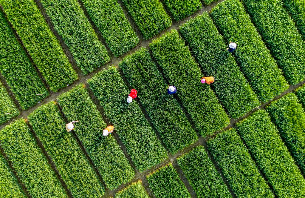2022年3月30日,在安徽省合肥市庐江县白湖镇省级现代农业示范区育种基地,农民在小麦育种田清除杂草。新华社发(左学长 摄)