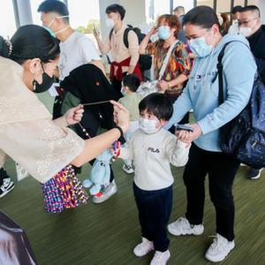 1月24日,在菲律宾马尼拉国际机场,礼宾人员在抵达大厅为中国游客戴上串珠项链。新华社发(乌马利摄)