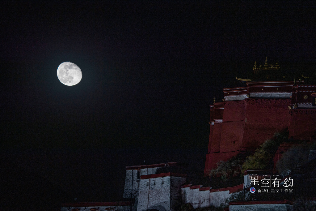 2022年11月11日晚在拉萨布达拉宫附近拍摄的火星合月。新华社记者孙非 摄