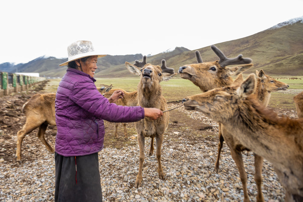 ↑2022年5月21日,向秋拉姆在类乌齐马鹿国家级自然保护区内照顾马鹿。
