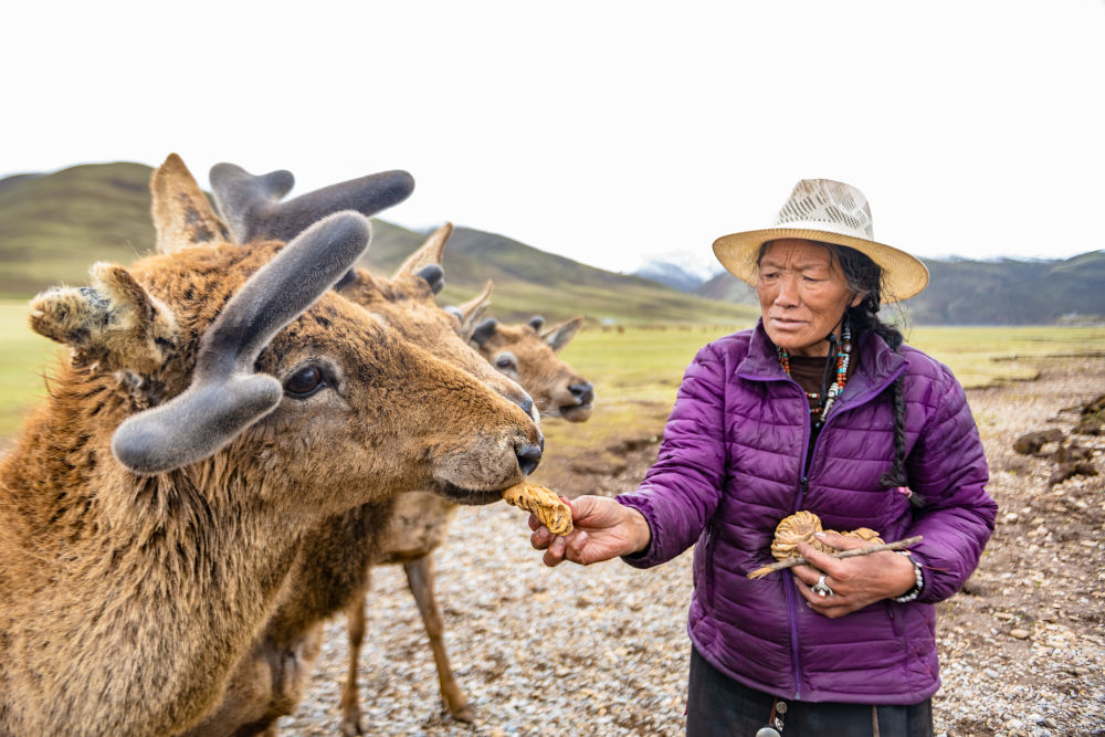 五十多年前,向秋拉姆上山干活时,发现三头刚出生的小马鹿,担心它们饿死或被野兽叼走,便把它们抱回了家。年幼的马鹿无法自主进食,向秋拉姆便嘴对嘴给它们喂牦牛奶;晚上担心小马鹿着凉,她甚至搂着它们一起入睡。她说:“当时家里条件并不好,只养了三四头牦牛,青稞也刚够家人吃的,但这是与我有缘的生灵,绝不能让它们饿着。”两年后,向秋拉姆将它们放归山野。令人惊喜不已的是:在冬天,三头马鹿回来了,还带来另外几头“小伙伴”。