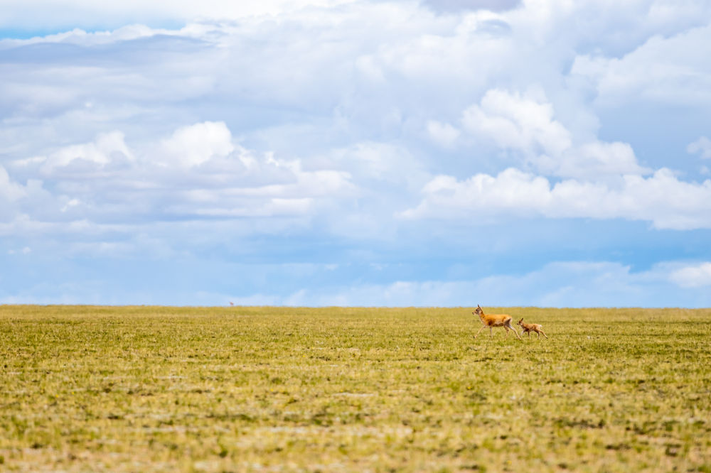 七月,我们正巧赶上藏羚羊产崽季。一只刚出生的小藏羚羊支楞着耳朵,瞪大乌黑的眼睛望着我们,四肢蜷缩匍匐在草地上,身体湿漉漉的。它喘息着努力站起,却跌倒在地,再次撑起,又跌倒。微风吹拂,阳光抚慰,给予它生的力量,终于稳稳地站立起来。