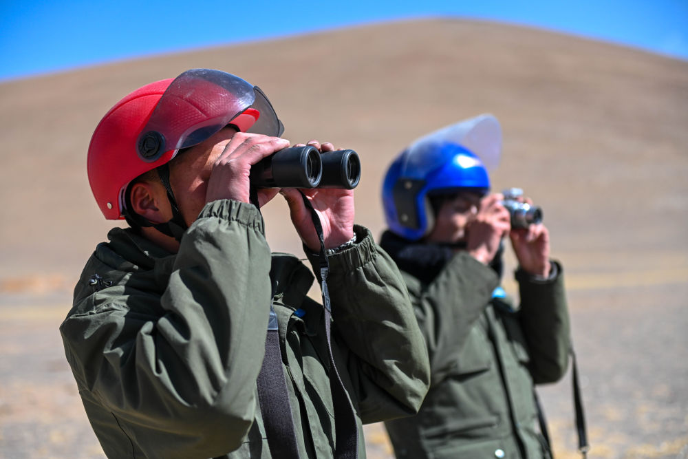 ↑2022年3月26日,洛桑日达(左)与队友正在观察野生动物。