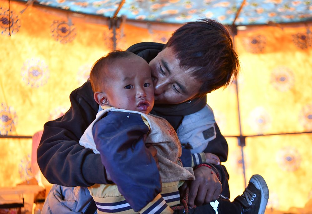 ↑2022年7月18日,西热加措在放牧点的帐篷内亲吻儿子曲扎加措。新华社记者晋美多吉摄
