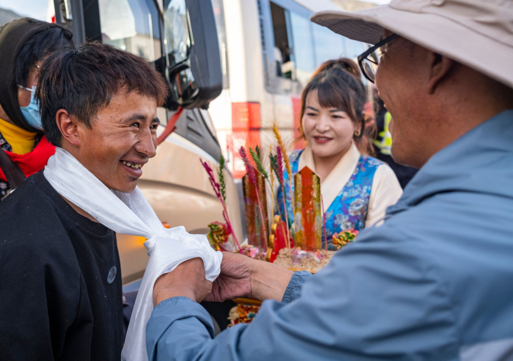 19日20时许,经过12个小时的长途跋涉后,18辆客车缓缓驶入森布日,300多名多玛乡群众抵达新家园。一阵阵激昂的藏戏鼓声、一声声“欢迎到家”的美好祝福,当地群众手举象征五谷丰登的“切玛盒”,逐一献上哈达,迎接新邻居。