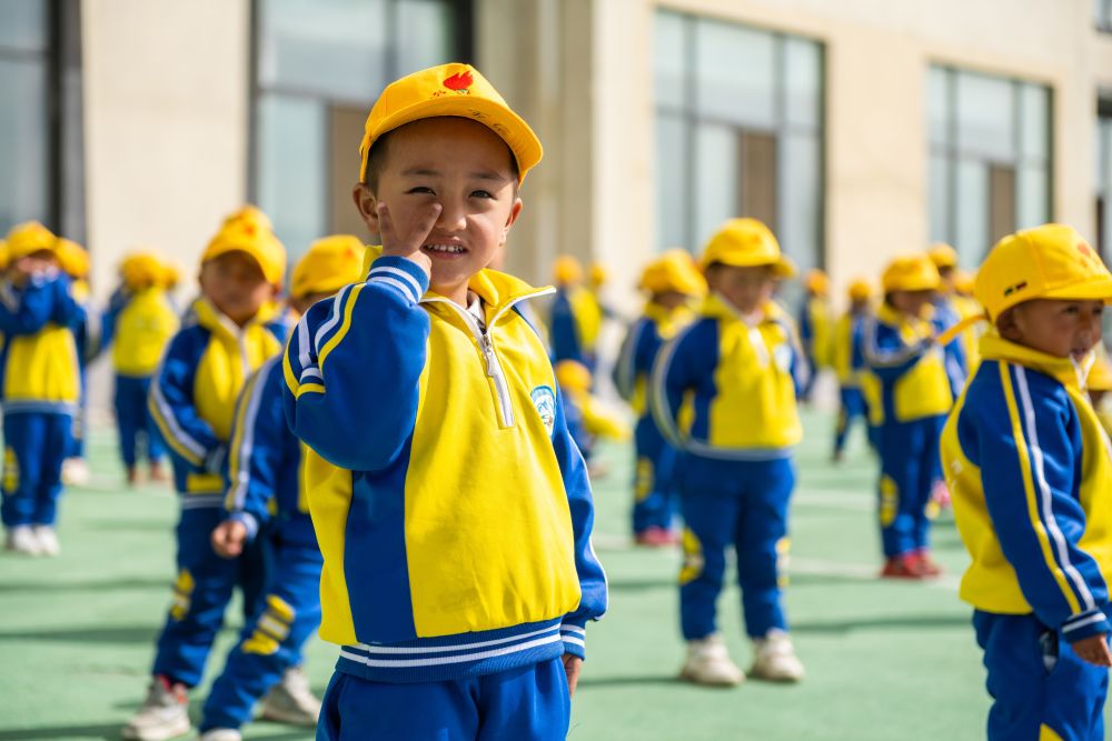 ↑2022年3月22日,霍党生在森布日幸福家园第一双语幼儿园准备跳课间操。
