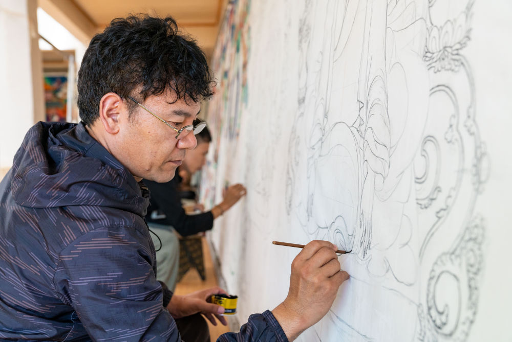 ↑2022年8月5日,平措多布杰和徒弟一起绘制大型唐卡作品。