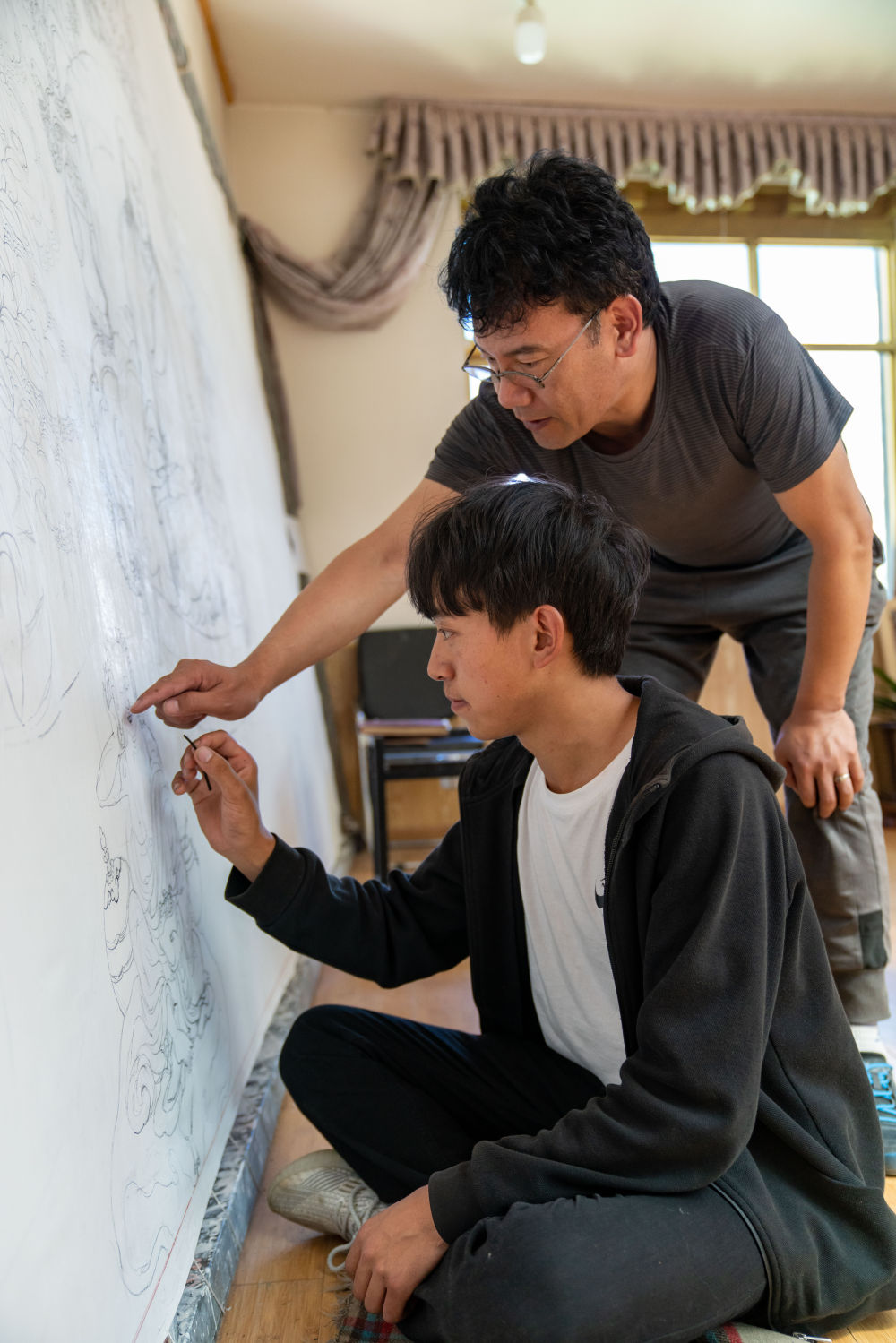 ↑2022年8月6日,平措多布杰指导儿子索朗旺旦绘制唐卡作品。