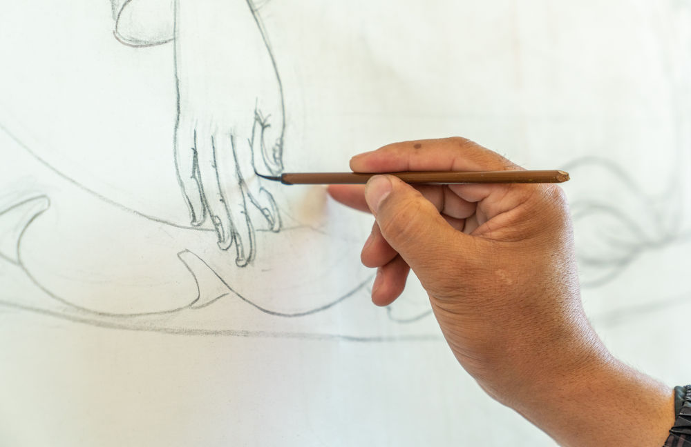平措多布杰端着装满颜料的碗,指导在梯子上描线的徒弟说:“心要静,笔要稳,描线、勾笔、造像……每一步都不能马虎,绘制唐卡考验的是耐心。”