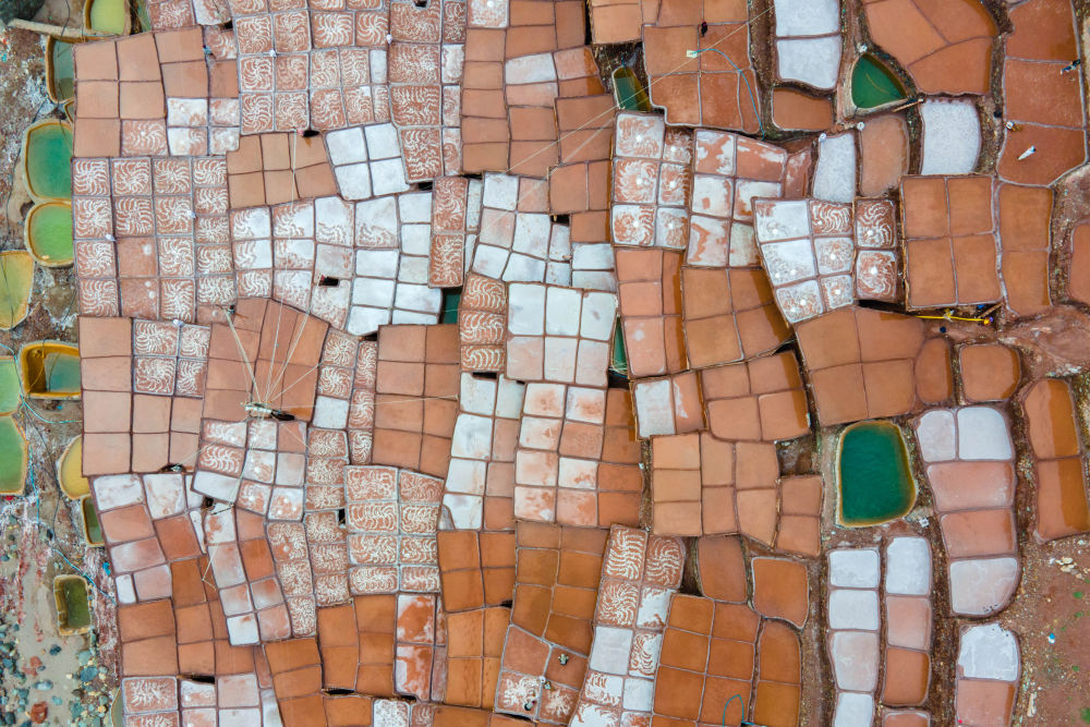 每块盐田面积约5平方米,架空于山间,上方覆上透水性差的黏土,下方由木棍支撑。站在盐田底部仰望,能看到盐滴结晶而成的盐柱。这项古老的技艺在加达村已传承1300余年。2008年,盐井地区的食盐晒制技艺入选国家非物质文化遗产名录,至今保存着3500多块盐田。