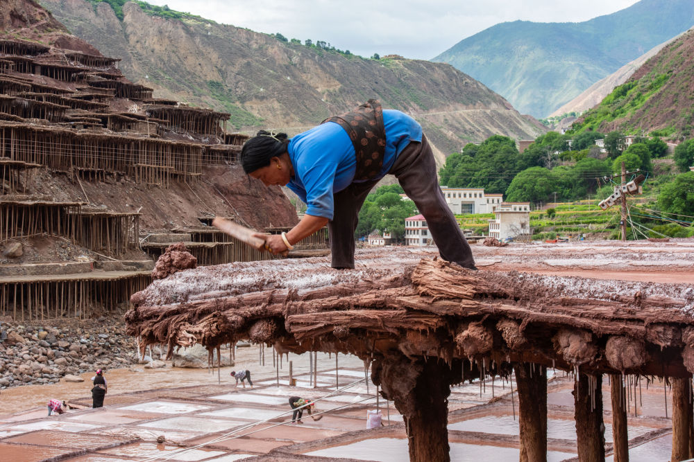 村民美拉一早来到盐田,开始一天的劳作。“3月到6月是晒盐的黄金时间,等到雨季来临,就不好晒盐了。”她边忙碌边说,从浇灌卤水到析出盐晶,一般需要12天左右,经过高原强烈的光照和烈风蒸发,一块盐田产量约在25公斤左右。她的13块盐田每年可以带来一万多元的收入。
