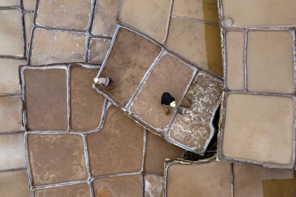 ↑2022年5月26日,加达村村民在古盐田里劳作。