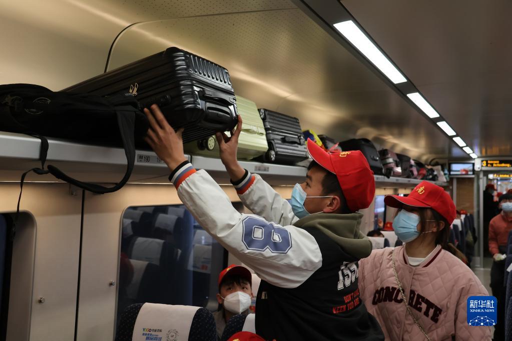 1月30日,旅客在D2879次务工专列上放行李。这是2023年贵阳开出的首趟高铁务工专列。新华社记者 刘续 摄