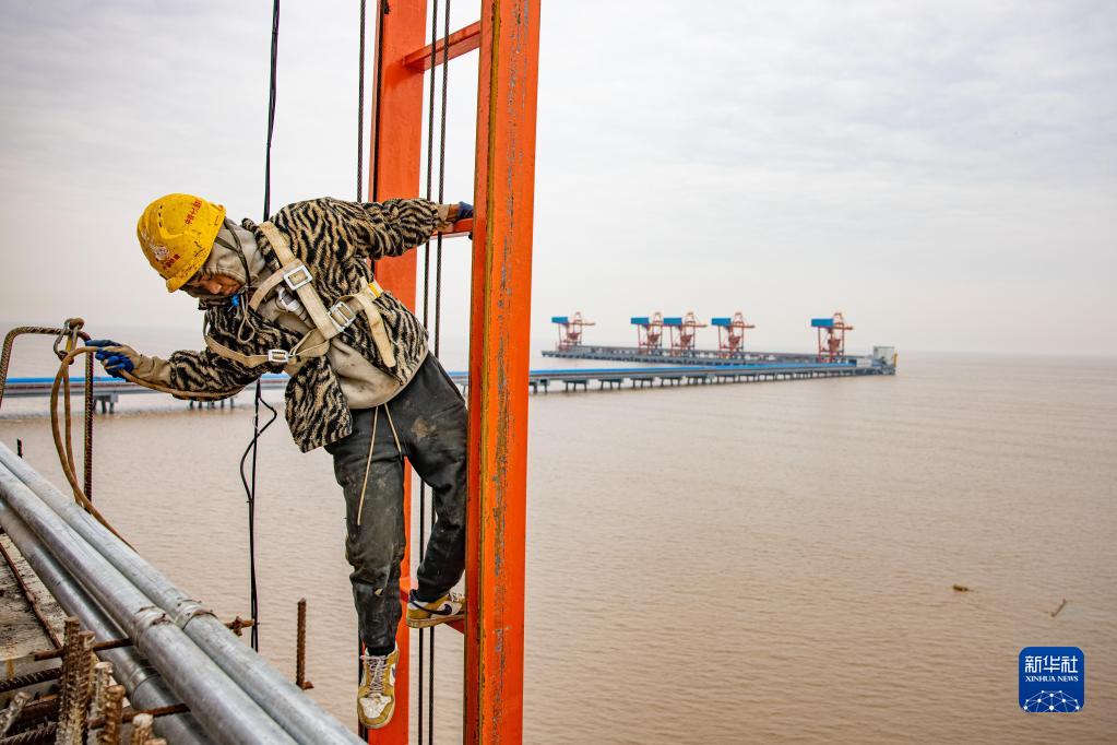 连日来,在杭甬高速复线一期工程现场,工人们顶着海风加紧施工建设,现场一派繁忙。杭甬高速复线一期工程全长约55.833公里。