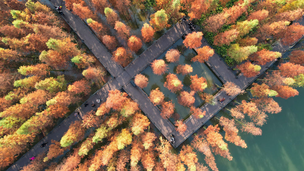 2022年11月26日,游客在贵州省遵义市播州区播州湿地公园的水杉林中游玩。新华社发(李仁军摄)
