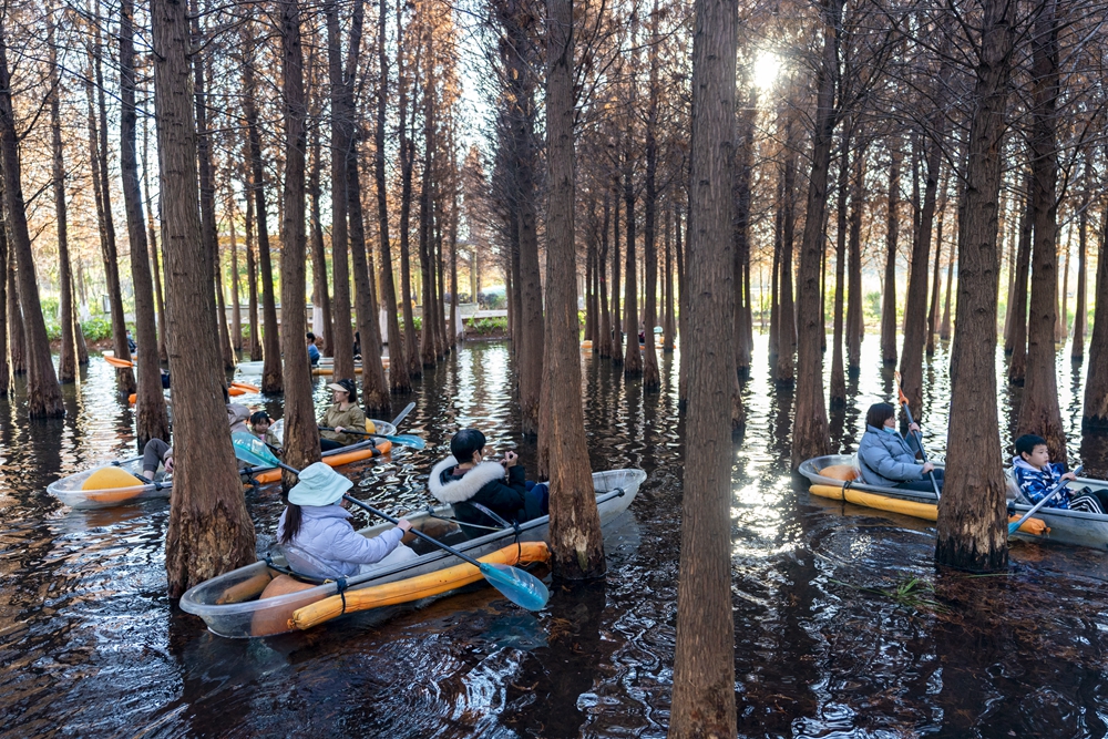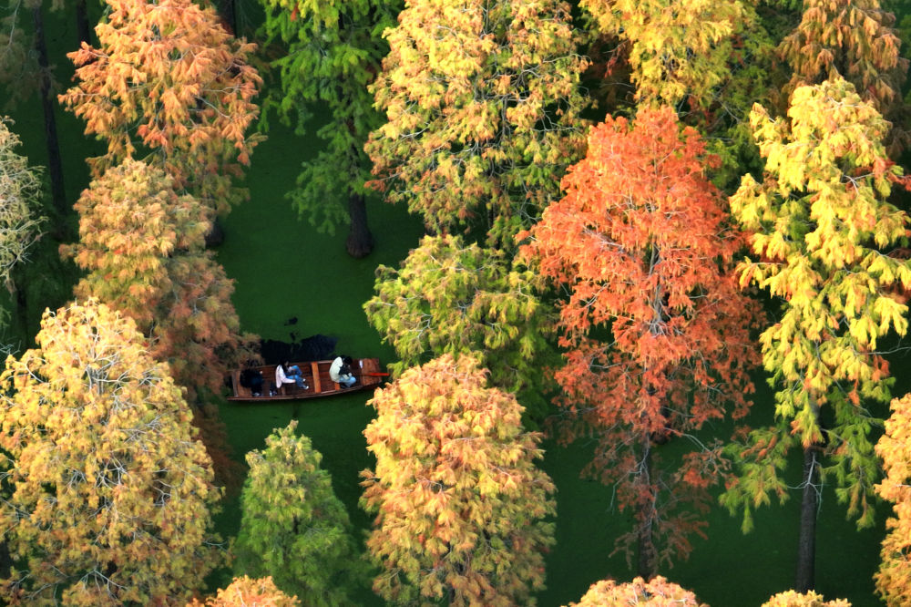 2022年11月9日,游客在位于江苏省扬州市江都区邵伯镇的渌洋湖湿地公园的水上森林乘船游览。新华社发(孟德龙 摄)