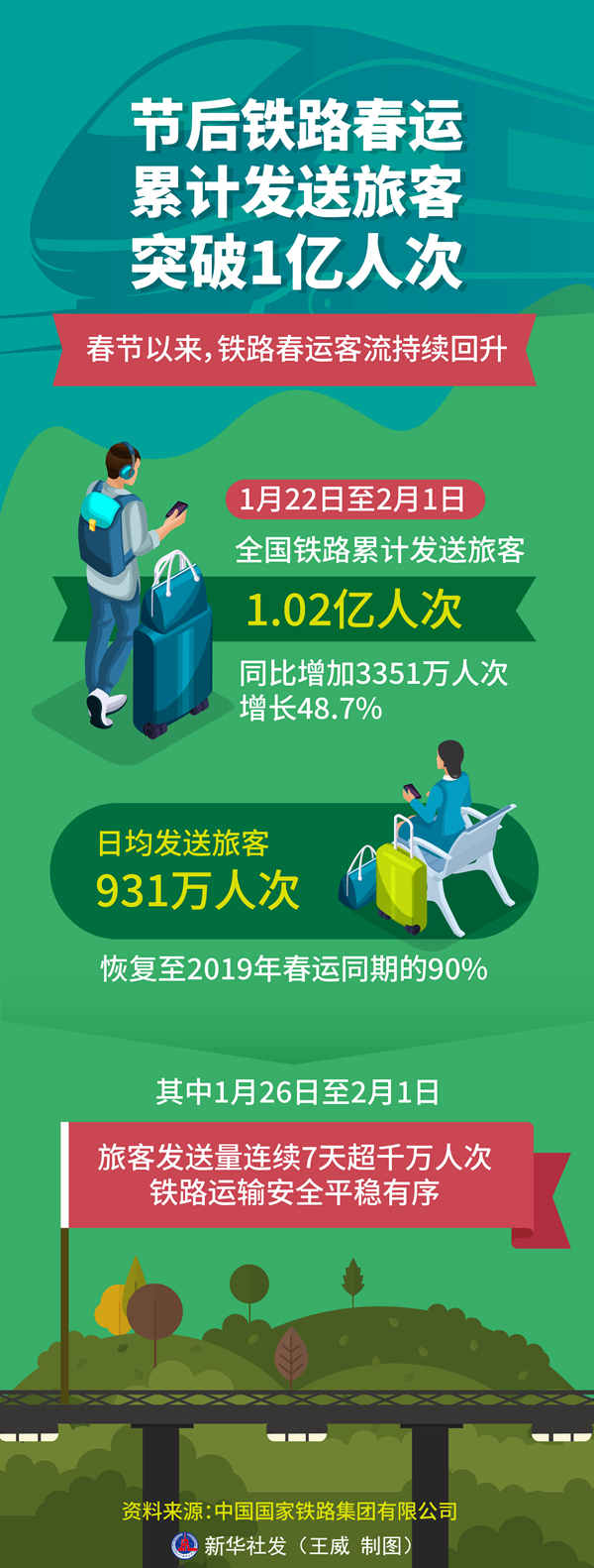 新华社北京2月2日电(记者樊曦)记者2日从中国国家铁路集团有限公司获悉,春节以来,铁路春运客流持续回升,1月22日至2月1日,全国铁路累计发送旅客1.02亿人次,同比增加3351万人次,增长48.7%,日均发送旅客931万人次,恢复至2019年春运同期的90%,其中1月26日至2月1日旅客发送量连续7天超千万人次,铁路运输安全平稳有序。
