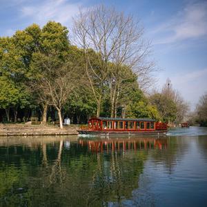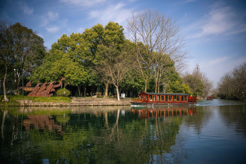 游船在西溪湿地水域行驶。新华社记者 江汉 摄