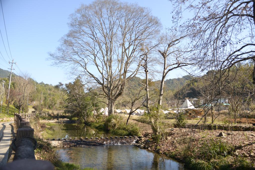 “现在时间还早,跳舞暖和一下,顺便等等游客。”一旁大树上挂着郭泉金“桥下泡茶”的招牌,“游客们喜欢在溪边泡茶。”郭泉金说,最近几年溪水越来越干净,游客也越来越多。