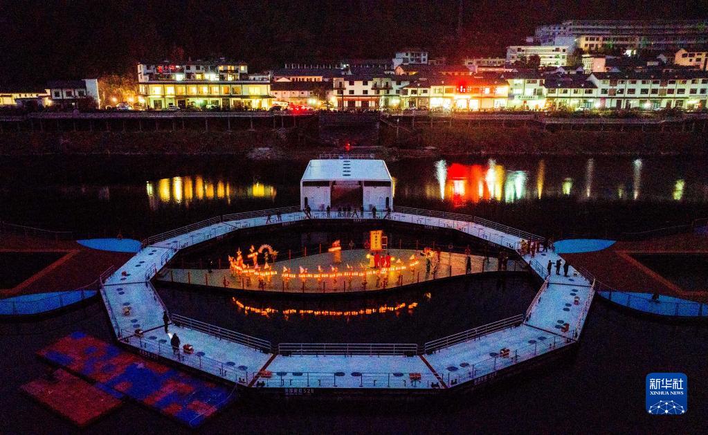 2月2日在浙江省杭州市淳安县里商乡拍摄的里商仁灯元宵表演(无人机照片)。
