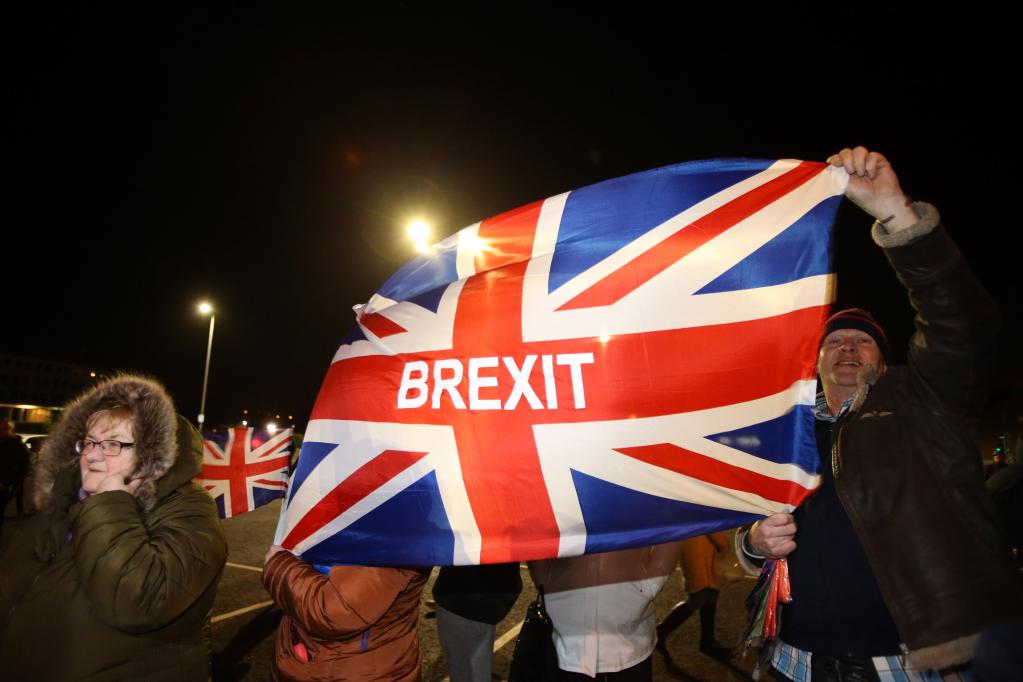 2020年1月31日晚,在英国北爱尔兰贝尔法斯特,支持“脱欧”的人们参加庆祝集会。伦敦时间1月31日晚11时,英国正式“脱欧”,结束其47年的欧盟成员国身份。新华社发(保罗·麦克兰摄)