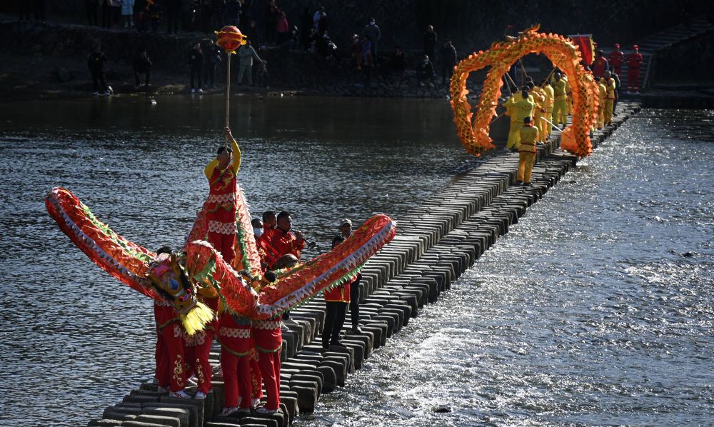 春节期间,浙江温州泰顺县仕阳镇仕水碇步的“碇步龙”表演。受访者供图
