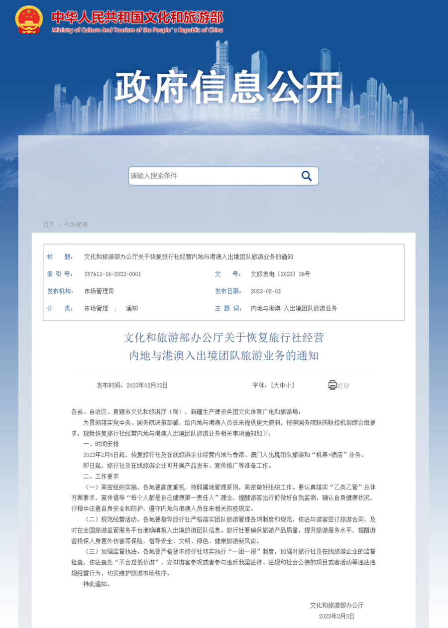 2023年2月6日起,恢复旅行社及在线旅游企业经营内地与香港、澳门入出境团队旅游和“机票+酒店”业务。