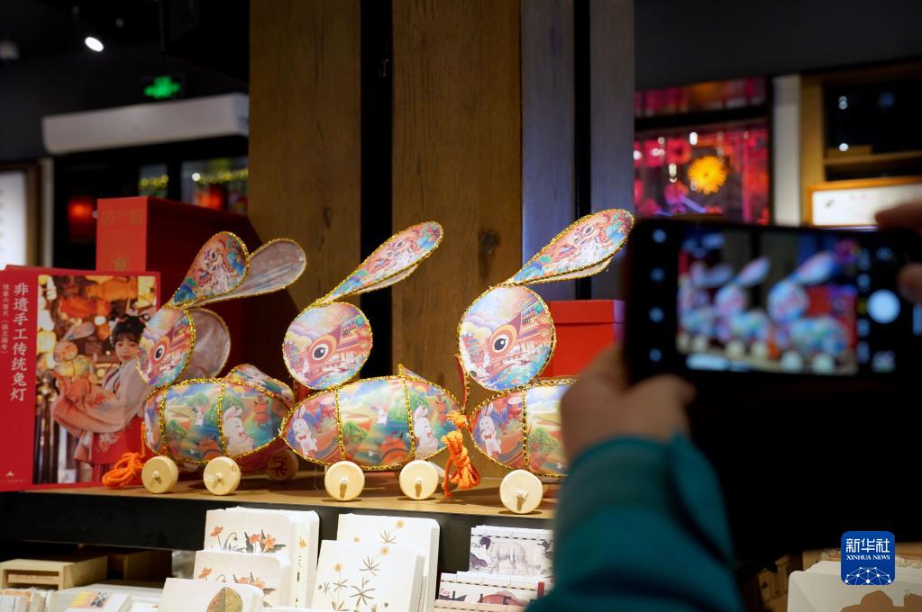 2月3日在豫园文创商店拍摄的传统手工兔子灯。