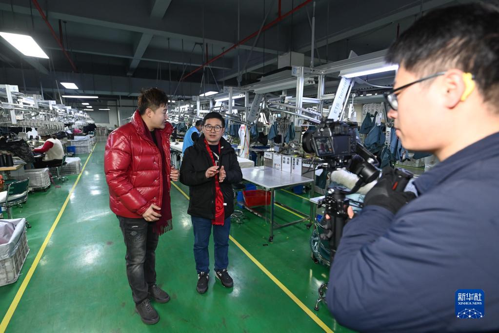 2月4日,在义乌市苏溪镇棒杰数码针织品有限公司车间,企业负责人(左二)通过线上直播介绍企业情况及用工需求。