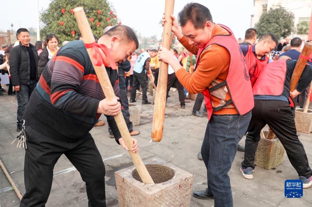 2月3日,四川省华蓥市华龙街道办事处的居民在东方村参加趣味活动“打糍粑”。
