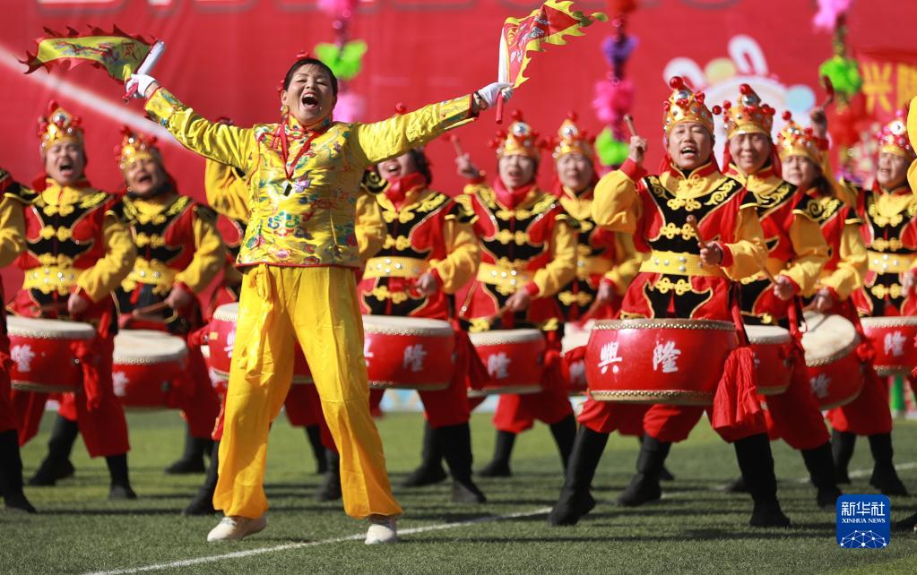 2月4日,陕西省渭南市合阳县体育场内,居民进行锣鼓展演。