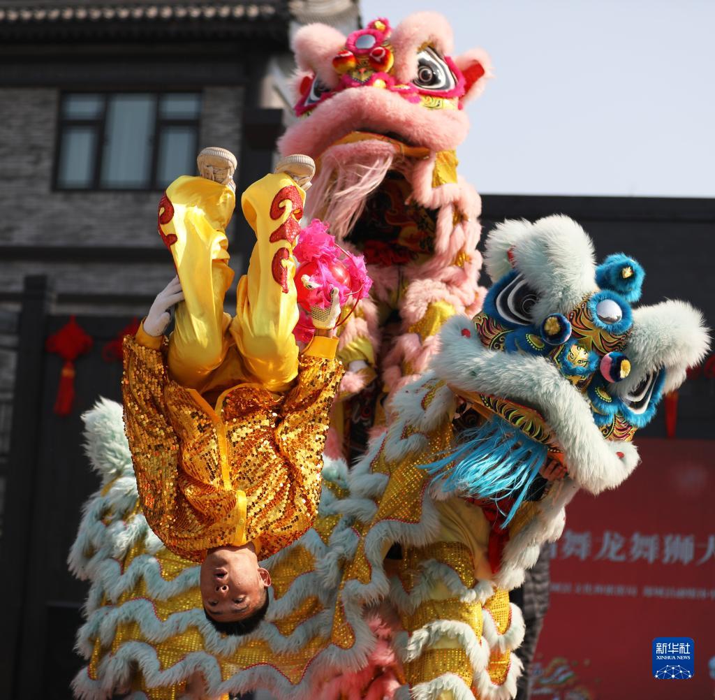 2月4日,在山东省郯城县郯国古城景区,舞狮队在舞龙舞狮大赛上表演。