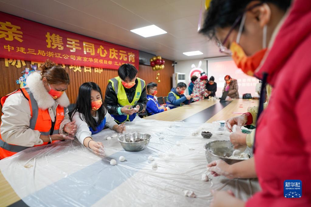 2月4日,在中建三局浙江公司南京华贸中心项目部,工人和南京市鼓楼区工人新村社区居民一起做汤圆。