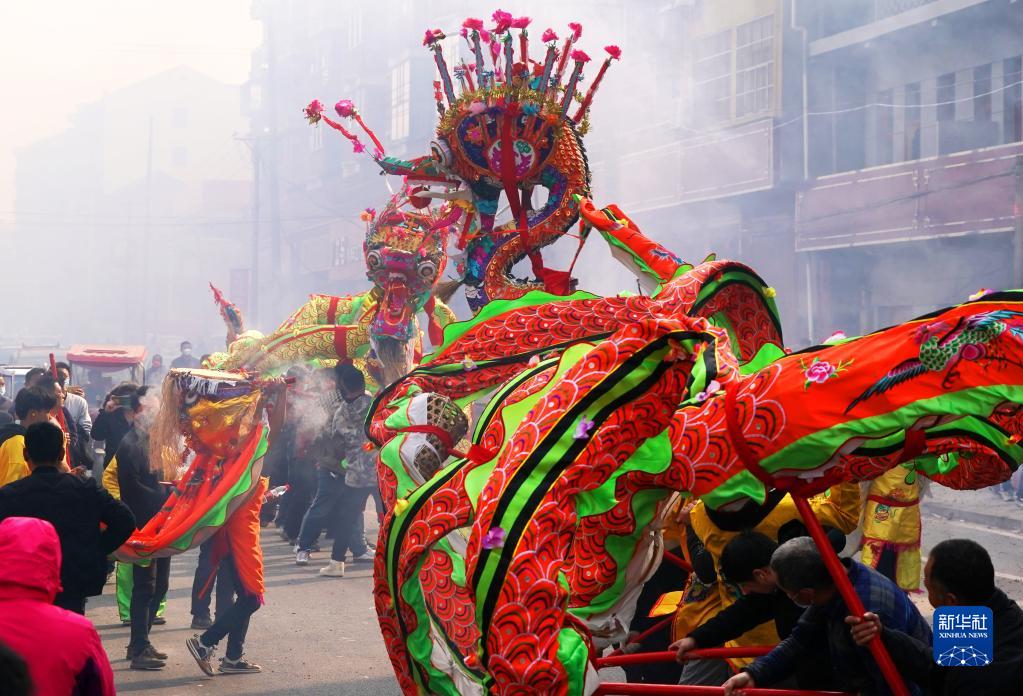 2月4日,湖北孝感杨店镇的居民舞龙队走街穿巷闹元宵。