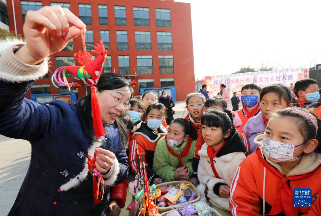 2月4日,在安徽省淮北市濉溪路小学,非遗文化传人向学生讲解立春“春鸡”手工香包。