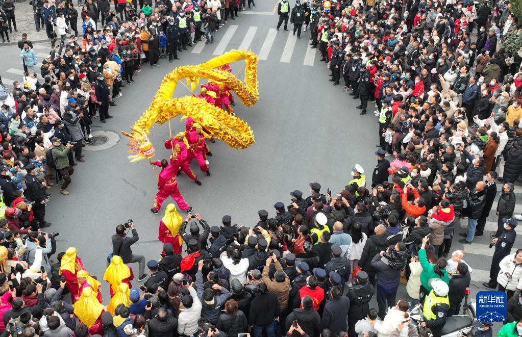 2月4日,浙江省湖州市德清县乾元镇第23届浙北乾龙灯会上,舞龙队在巡游表演(无人机照片)。