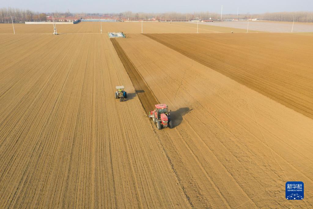 2月4日,在山东省东营市广饶县乐安街道春英家庭农场,大型机械在麦田里作业(无人机照片)。
