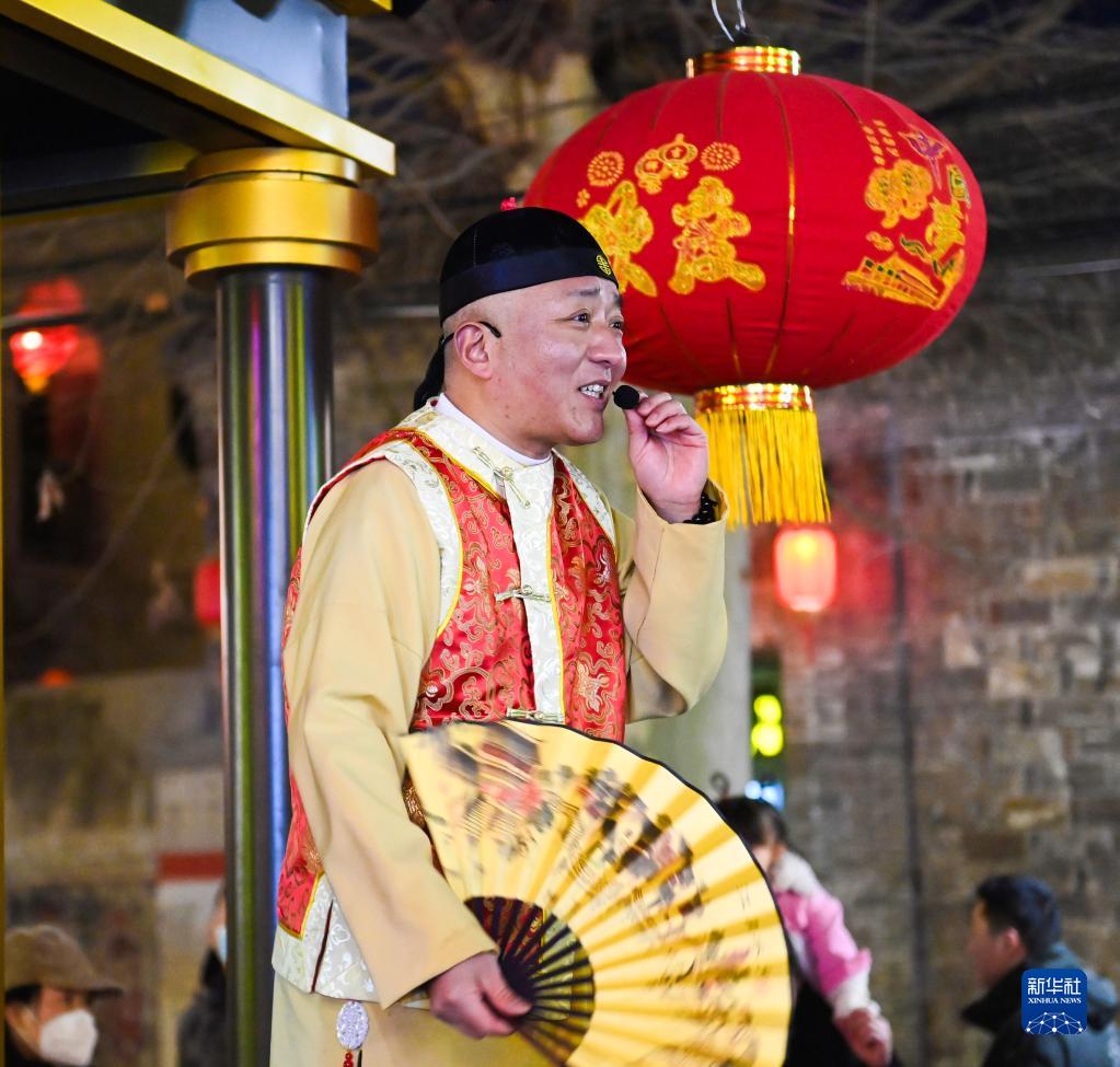 2月4日,一名评书演员在路边演出。
