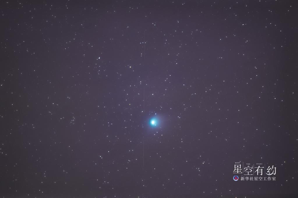 来自北京的天文爱好者王俊峰介绍,今年春节期间,他在辽宁东戴河利用专业设备对C/2022 E3彗星进行了观测和拍摄。“我采用多张拍摄叠加降噪的方法,凸显了这颗非常漂亮的‘蓝色精灵’。在拍摄的时候还有一颗流星划过,与彗星同框。通过放大,我看到彗星的头部是非常迷人的绿色和蓝色,还带有一点淡淡的紫色,非常可爱。”