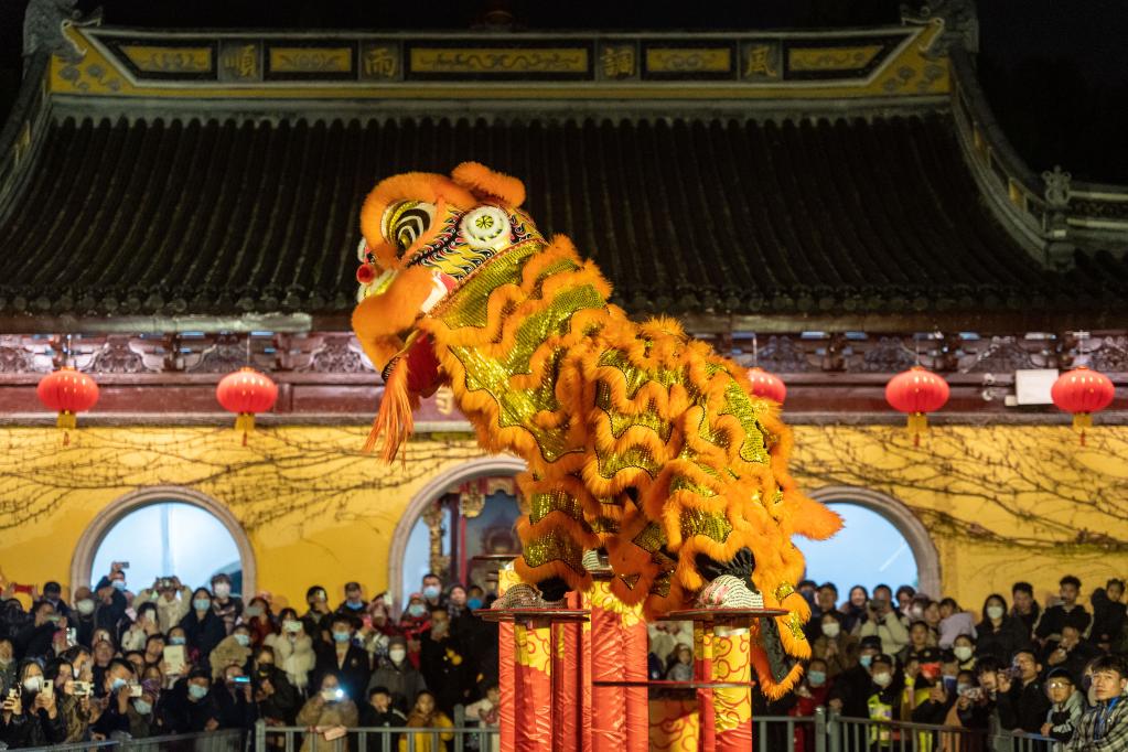 游客在江苏省无锡惠山古镇景区观看舞狮表演(1月22日摄)。新华社发