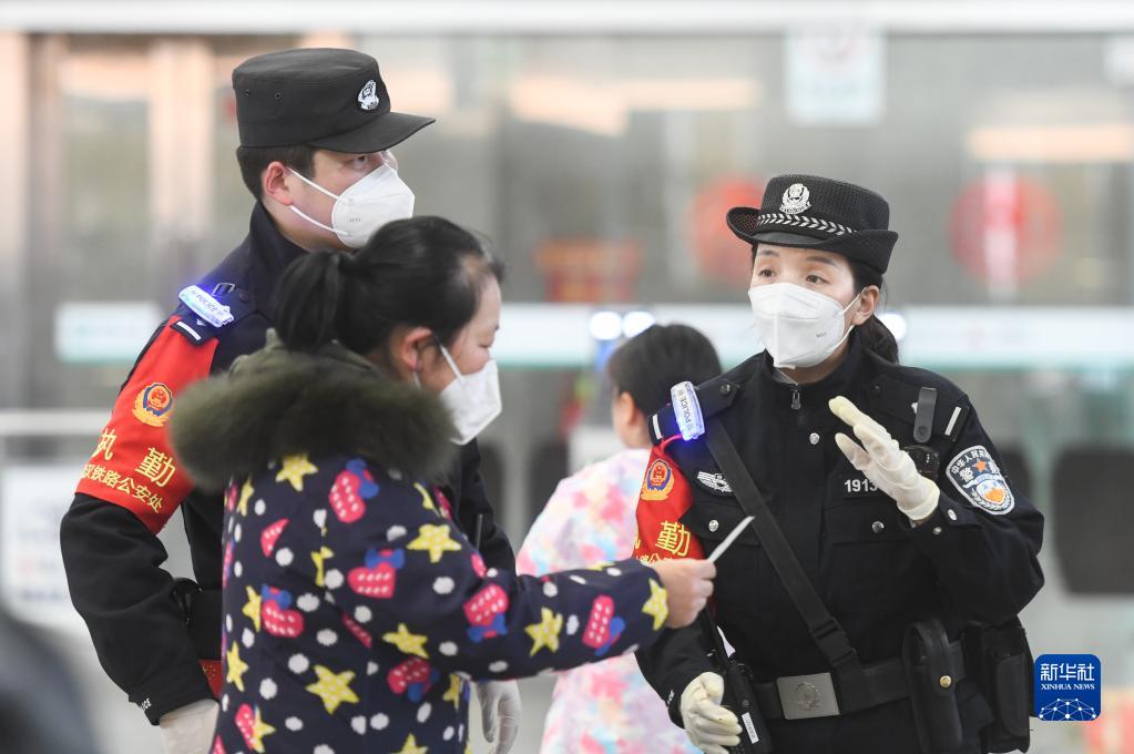 2月5日,武汉铁路公安处武昌车站派出所民警白玛卓玛(右)和同事在武昌站候车大厅值勤。